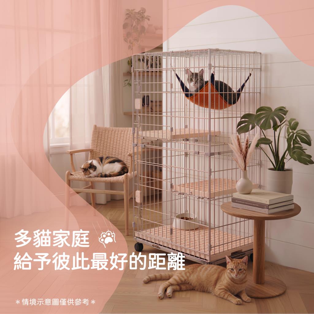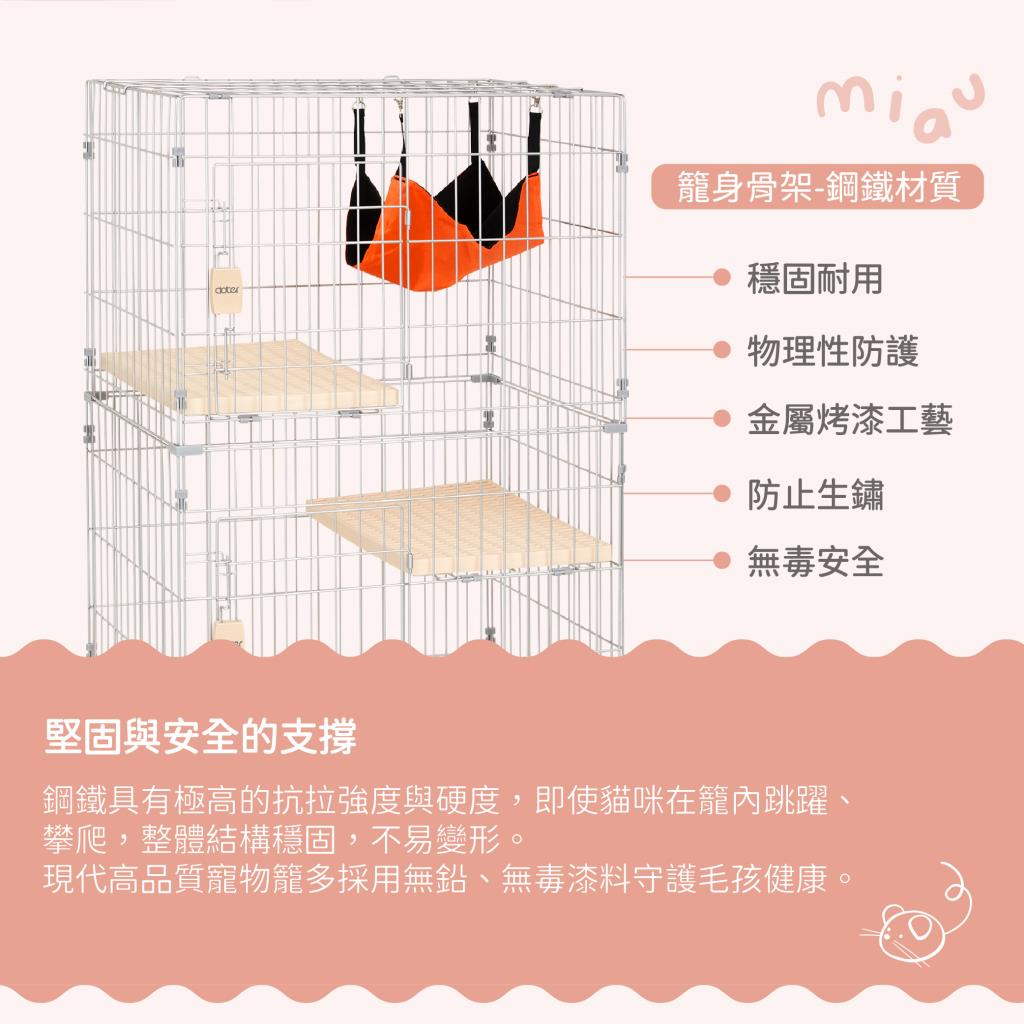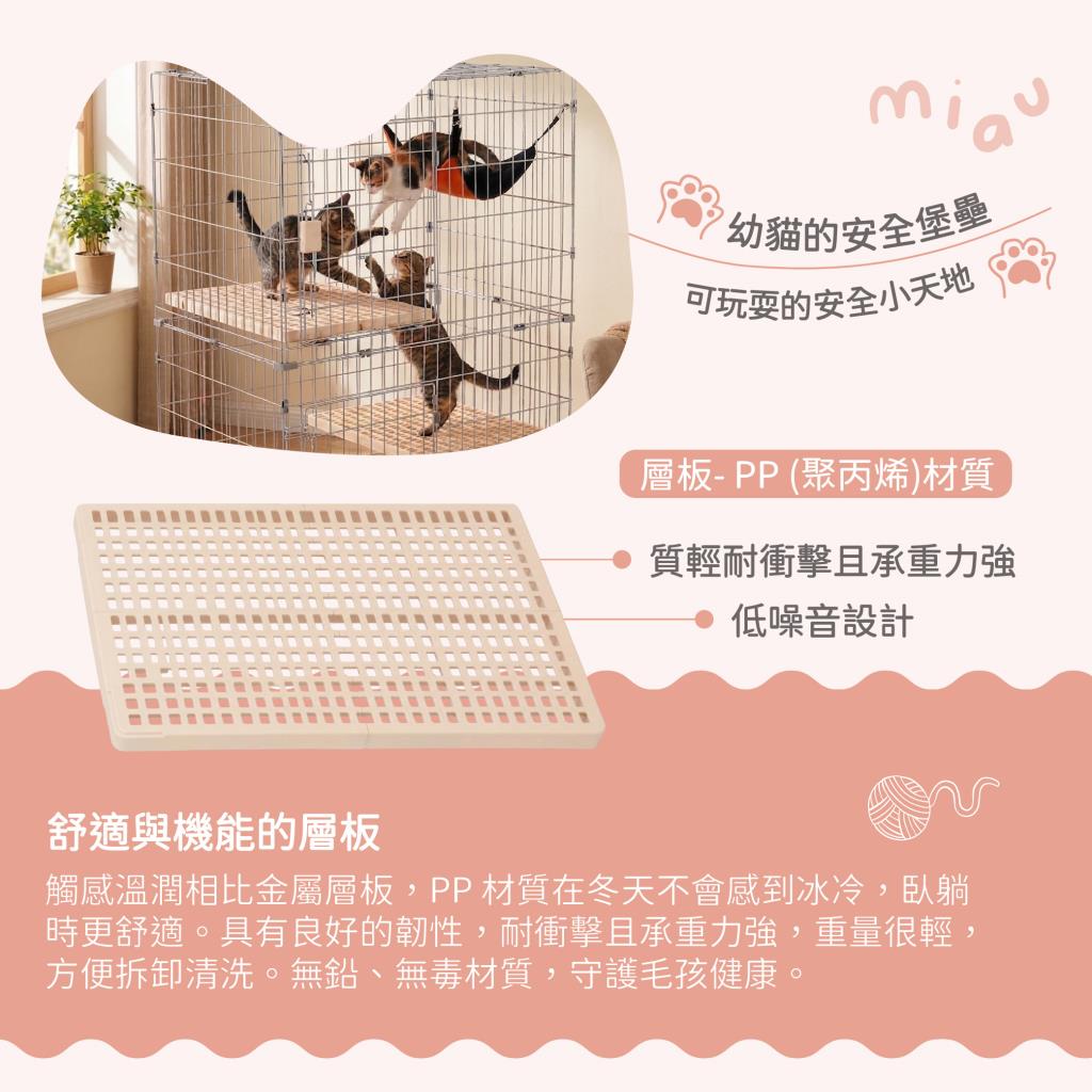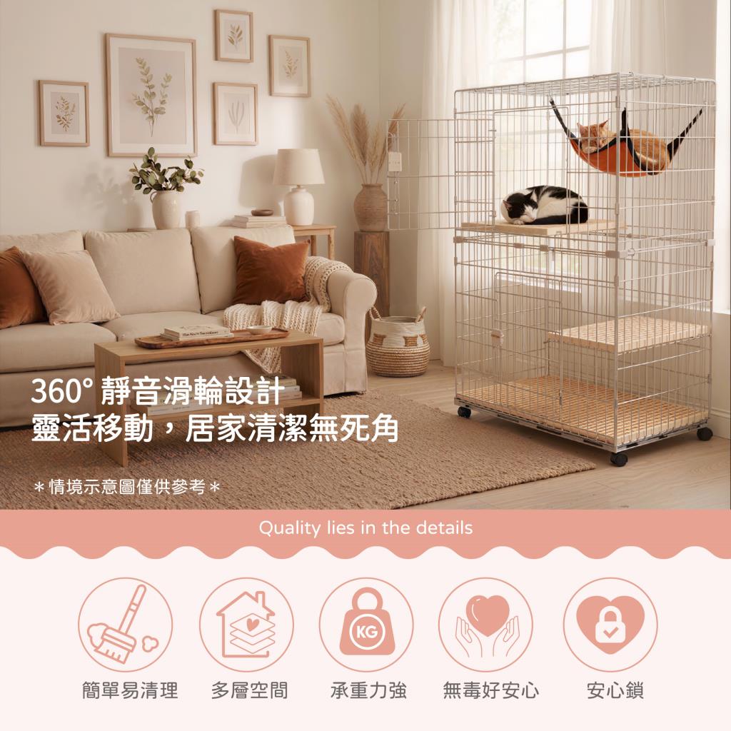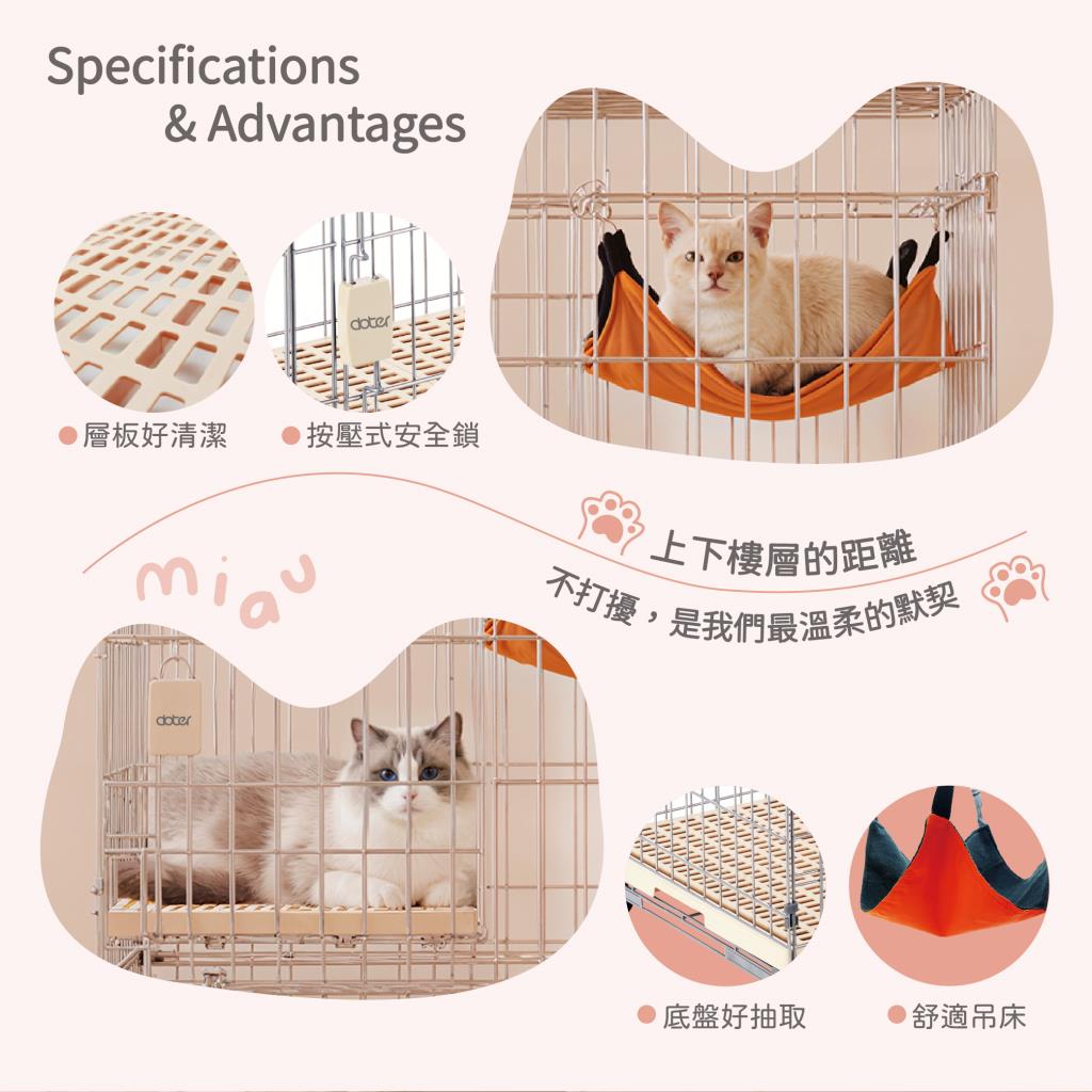 透氣層板(跳板)不易卡髒污。抽屜式底盤好清理。按壓式安全鎖,愛寵不易逃脫。底座附滾輪設計,移動方便。附貓籠專用吊床。