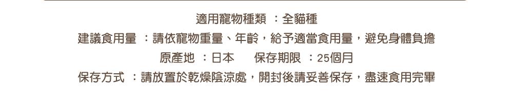 請依寵物重量、年齡,給予適當食用量,避免身體負擔